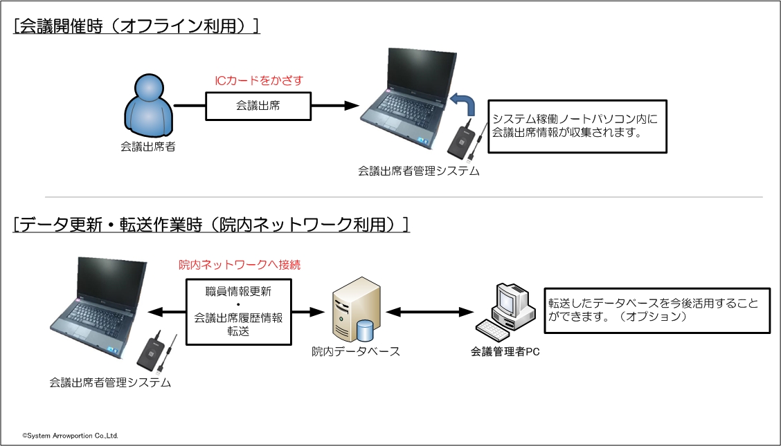 課題として、どのような手段で出席を正確に管理するのかどうかが課題でした。今回の病院様では、既存で入退室管理にFelicaを利用したシステムを利用されており、全職員様が常にFelicaカードを携帯されているという点を活かし、Felicaリーダにより出席を管理することを考えました。パソコンにつないだFelicaカードリーダにFelicaカードをかざすことで出席とみなし、管理できるという事です。(今回はFelicaカードでの運用としていますが、職員コードのバーコードや指紋認証などでも代替えは可能です。) 次はシステム構築の課題です。委員会等の会議や研修は常に決まった場所で行われるという事ではなく、時には臨時の場所で行われることもあるため、持ち運びが可能で、オフライン環境でも利用できるシステム構築が必要でした。対応として、システム構成に持ち運び可能なノートパソコンを採用し、ノートパソコン自体にデータベースを構築し、必要に応じて院内ネットワークと接続して、最新の職員情報(Idm番号)マスタに更新することができるように設計を行いました。